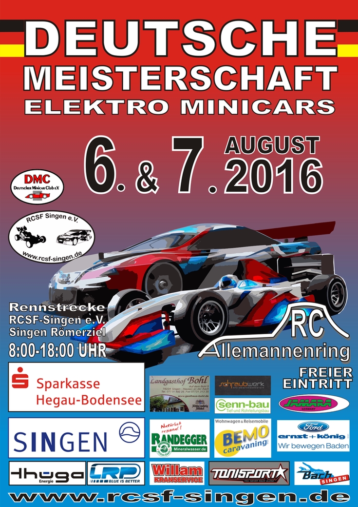 15.06.2016 - Veranstaltungshinweis « Neuerer Beitrag Älterer Beitrag » Deutsche Meisterschaft Elektro Minicars am 06. und 07.08.2016 in Singenhttp://www.rcsf-singen.de Eintrag von: Achim Staller