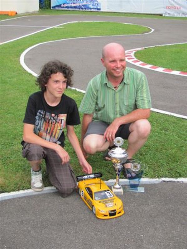 Valentin der sich inzwischen wieder nach vorne gekämpft hatte, gibt jetzt alles. Sein XRAY T3 geht perfekt, Runde um Runde kämpft er sich an Daniel heran, bis er direkt hinter ihm ist.