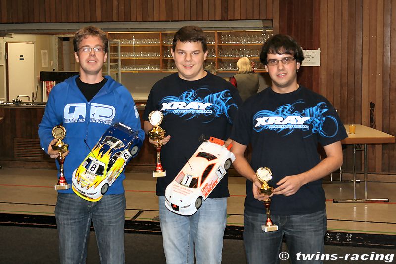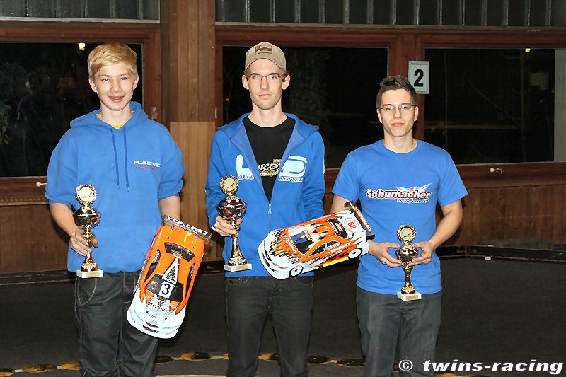 Tobias dagegen kämpfte selbst in den Finals noch mit Setupproblemen. Nach einem kompletten Umbau landet er im letzten Finale auf Platz drei, obwohl sein XRAY immer noch nicht so geht wie er es sich das wünscht. Im Gesamtklassement der Sportklasse belegt er daher leider nur den 4. Platz.Gratulation an Valentin, der mit seinem XRAY T3 2012, zwei der wohl derzeit schnellsten Sportfahrer, Daniel Wohlgemut (Deutschen Meister Indoor 2011) und Martin Hofer besiegte.